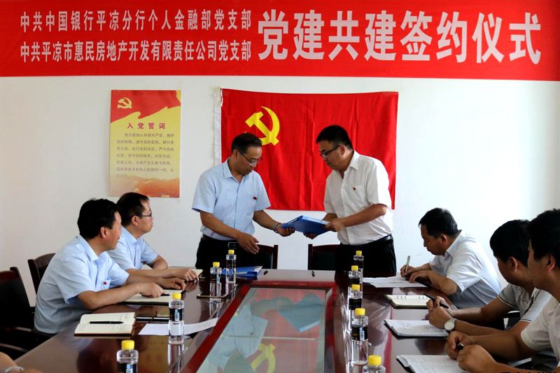 近日,中共平涼市惠民房地產開發有限責任公司黨支部與中共中國銀行平涼分行個人金融部黨支部黨建共建簽約儀式在中國銀行平涼分行舉行。惠民投資公司副總經理柳振源、中國銀行平涼分行紀檢書記秦建鋼、副行長楊震榮出席簽約儀式。