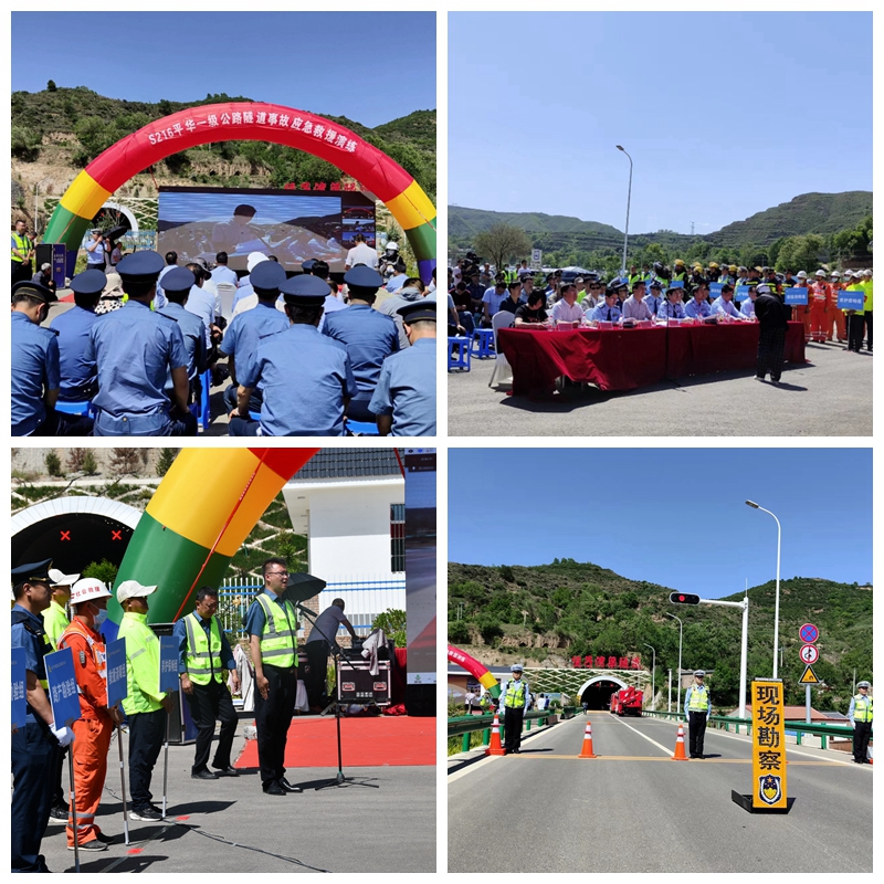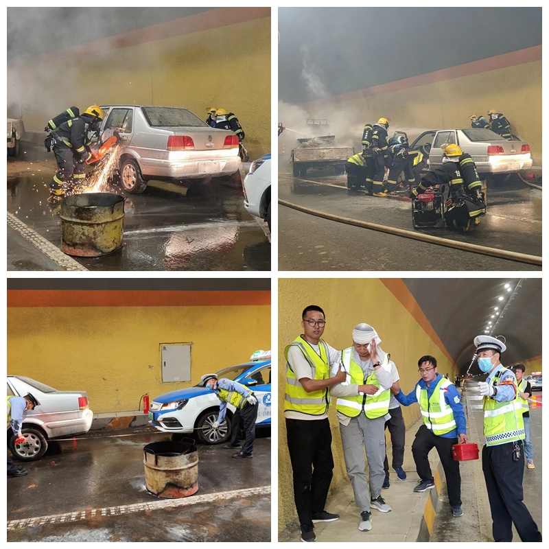 6月1日下午3時,隨著總指揮一聲令下,演練正式開始。演練模擬S216平華一級公路堡子灣梁隧道左幅華亭至平涼方向K31+800處,一輛輕型載貨汽車車廂內易燃品迅速燃燒,司機情急之下采取緊急制動,造成后方一輛小轎車和一輛出租車連環追尾,出租車內人員陷入昏迷,小轎車車門嚴重變形,司機無法脫身,車輛被迫停滯現場,等待救援,后方交通受阻。收費站監控員發現隧道內險情后,立即向帶班領導匯報,上楊收費站迅速啟動突發事件應急預案,并第一時間向上級單位、110、119、120、路政執法大隊聯動報警。交警部門協同巡檢、養護快速安全布控;交通執法部門協助消防官兵進行切割拆除,開展傷員施救及貨車車廂滅火工作;醫務人員展開包扎、運送傷員工作。交警及交通執法部門現場勘查取證完畢后,交通執法與清障隊伍立即啟用清障車輛將涉事車輛拖離事故現場,隨后由養護部門對事故現場撒落殘物進行清理。待現場各項處置環節完畢后,總指揮下達了撤除布控,解除交通管制命令。整個演練過程有條不紊,險情匯報、接警出警、定位搜救、現場醫療救護等救援行動專業有序,參演單位配合緊密,各司其職,受到現場觀摩單位的高度肯定。