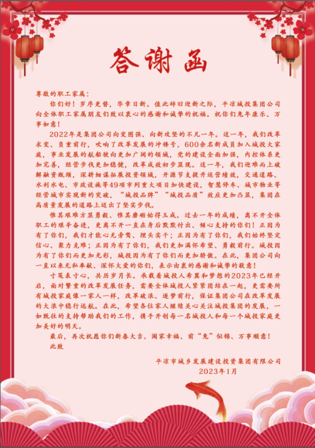 為感謝職工及職工家屬一年來的辛勤付出,架起公司與職工家屬溝通的橋梁,讓職工家屬更全面、深入地了解職工工作情況,更好地支持職工的工作,1月16日,平涼城投集團召開2022年度職工家屬答謝會。公司中層管理人員、掛職干部、2022年度“城投標兵”、先進個人及一線職工等40余名職工家屬代表齊聚一堂,共話公司發展和職工個人成長。