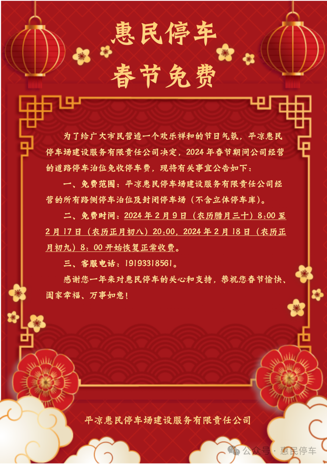 春節長假期間(除夕至正月初八),惠民停車場公司免費開放了城區經營范圍內的24處封閉式停車場和全部路側停車泊位,為市民和游客提供便利,助力營造歡樂祥和的春節氛圍。