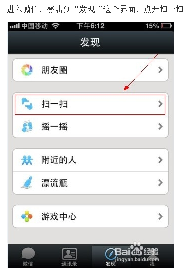1.進(jìn)入微信,登錄到“發(fā)現(xiàn)”這個(gè)界面,點(diǎn)開(kāi)掃一掃