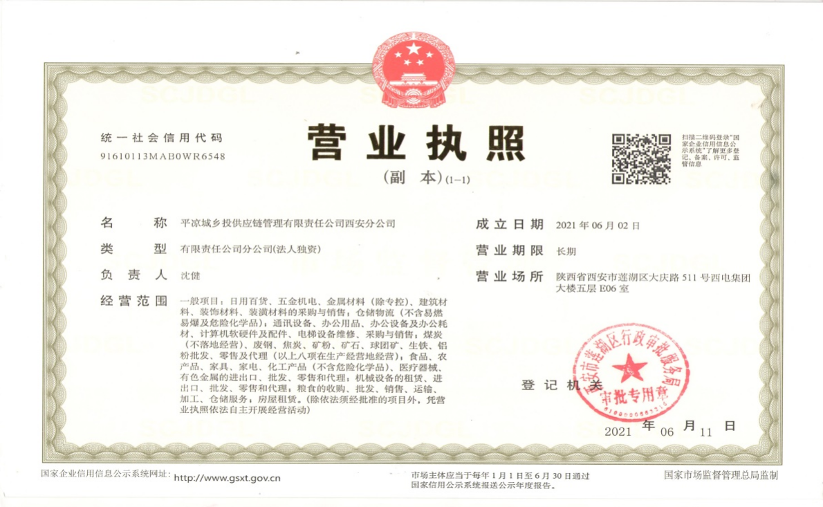 因公司業務發展需要,平涼城鄉投供應鏈管理有限責任公司在陜西省西安市設立了西安分公司,于2021年6月11日在陜西省西安市蓮湖區行政審批服務局完成了工商注冊登記,取得了營業執照。