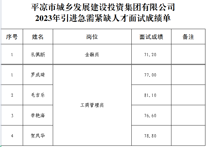 平涼市城投集團公司2023年引進急需緊缺人才面試成績公告