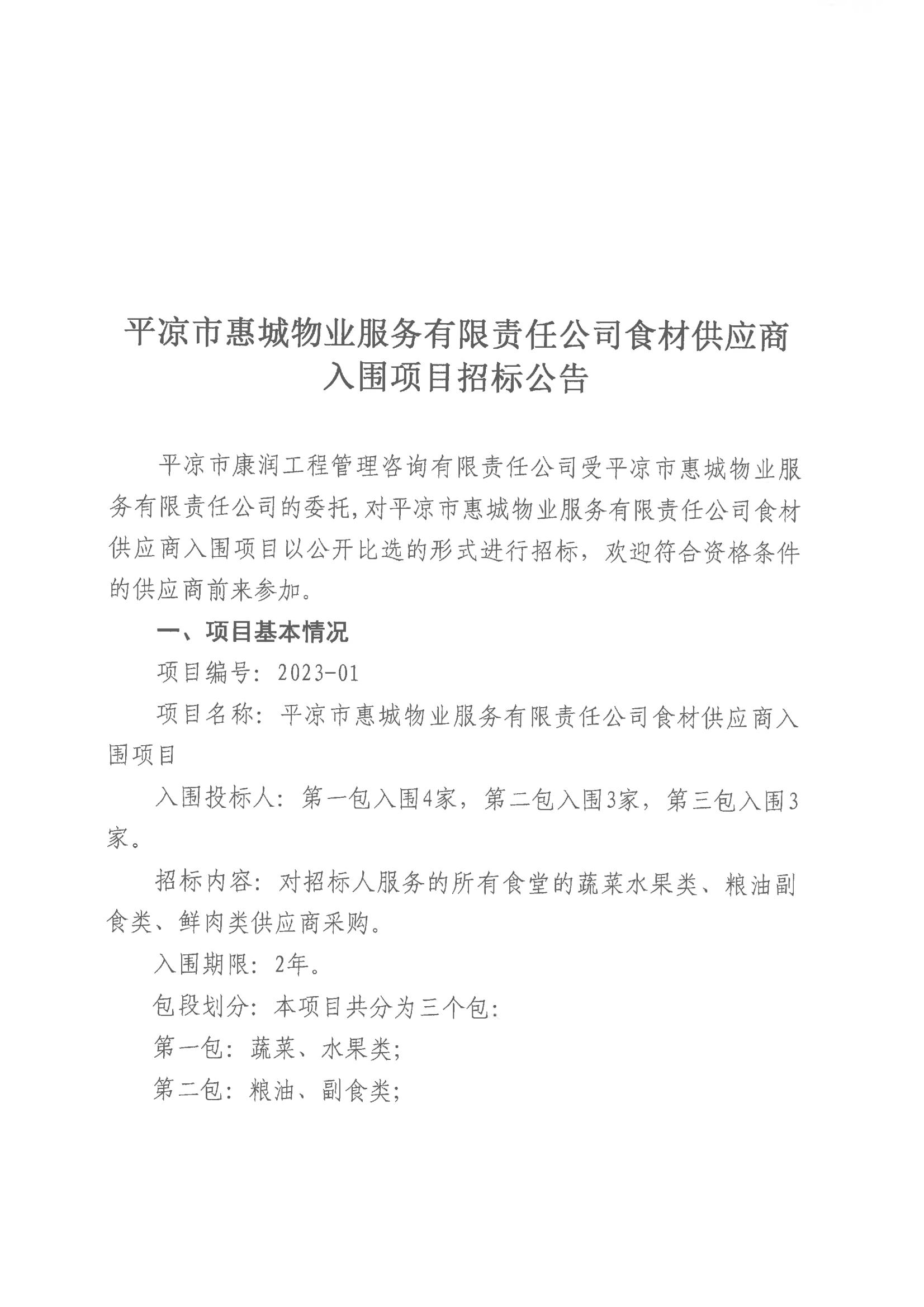 平涼市惠城物業服務有限責任公司食材供應商入圍項目招標公告