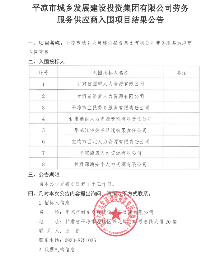 勞務(wù)服務(wù)供應(yīng)商入圍項(xiàng)目結(jié)果公告