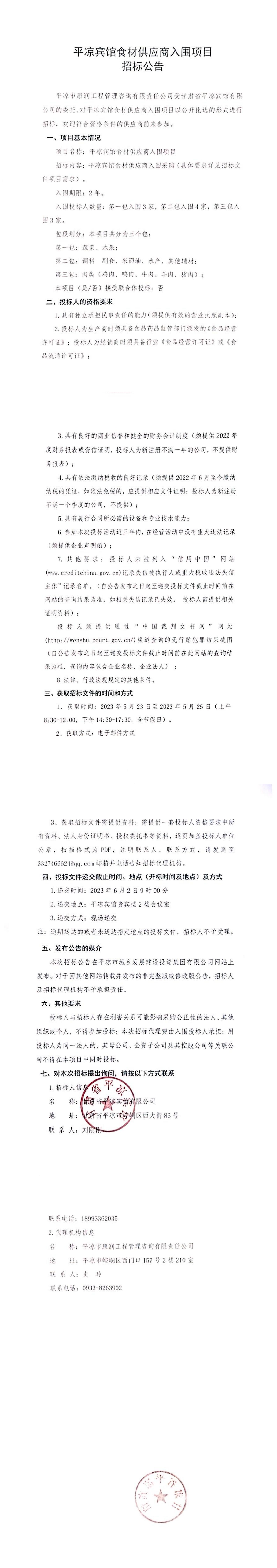 平涼賓館食材供應商入圍項目招標公告